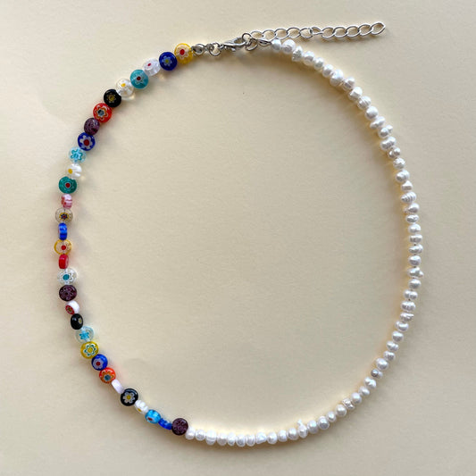 Half and half Millefiori and freshwater pearl necklace