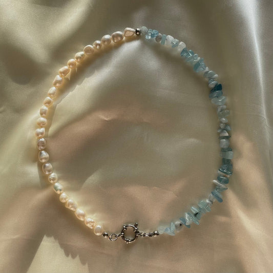 Half and half freshwater Pearl and blue aquamarine chip necklace