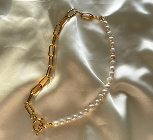 Half Freshwater Pearl and chunky gold chain necklace